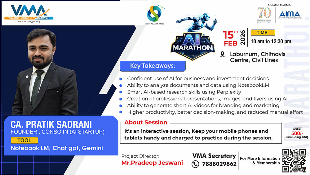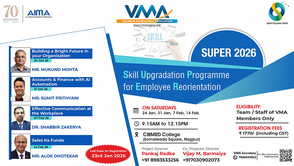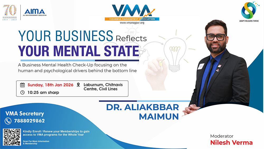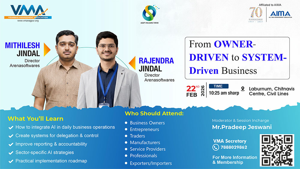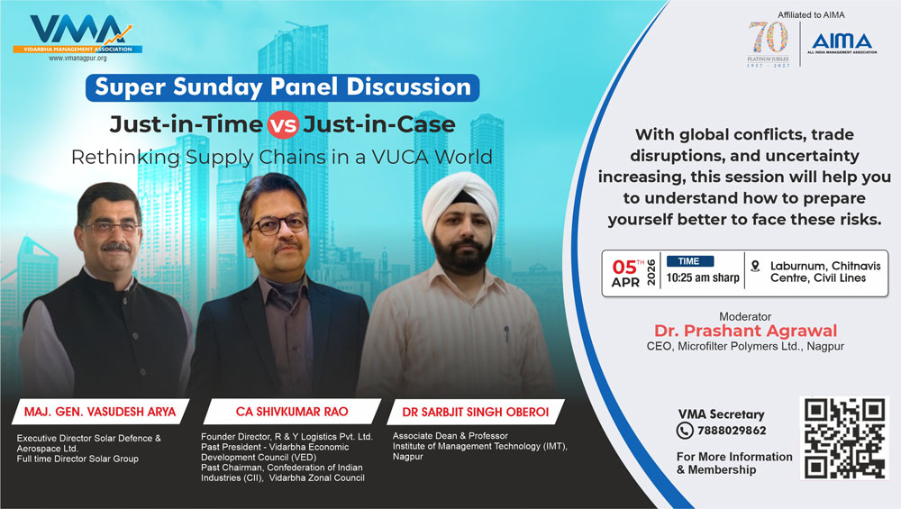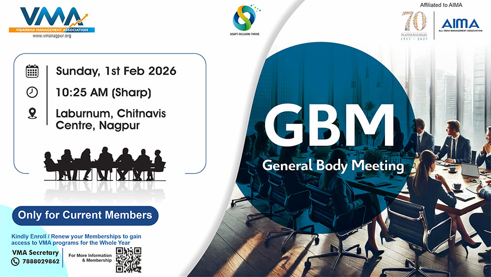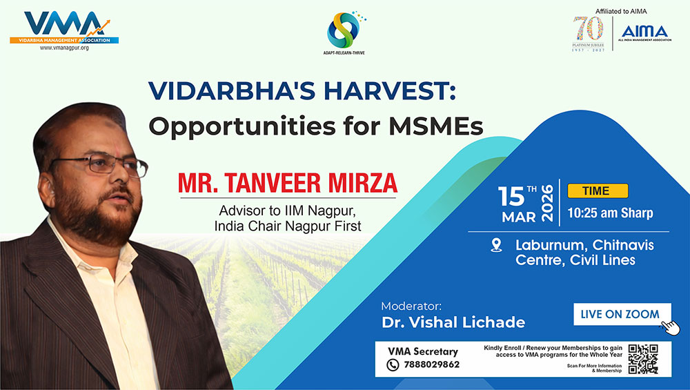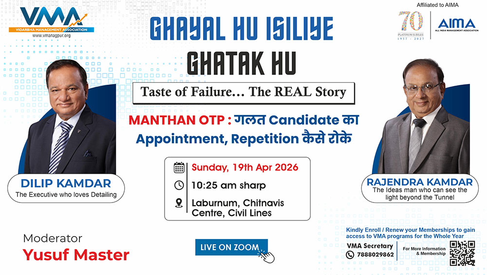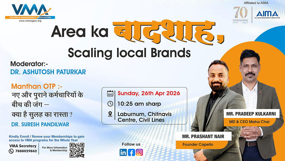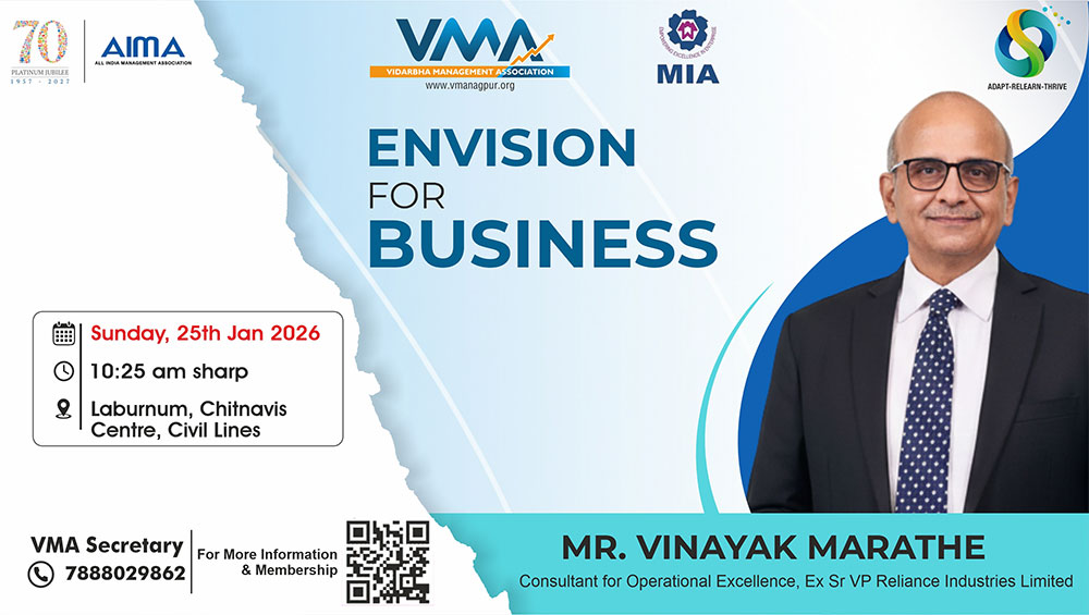 The Vidarbha Management Association (VMA) is a proactive organization dedicated to management learning, convening every Sunday at 10:30 AM. With 20 successful years behind us, we've been on a journey of knowledge sharing, learning dissemination, and community building. Our diverse range of events, sessions, and activities has contributed to the intellectual growth and development of the region.